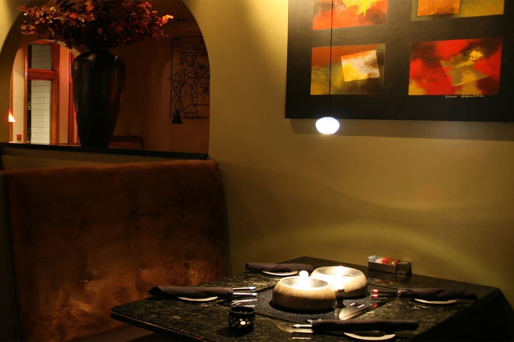 Simply Fondue is a social dining experience that invites guests to share their meals and eat together with their community. Sitting at the lounge or the bar, neighbors catch up on each others’ busy lives. Besides the long wall of local wines, a couple may contemplate which selection pairs best with their meal and date. Cozy booths with metal chandeliers and dozens of glowing candles provide an intimate haven for indulging in your senses.